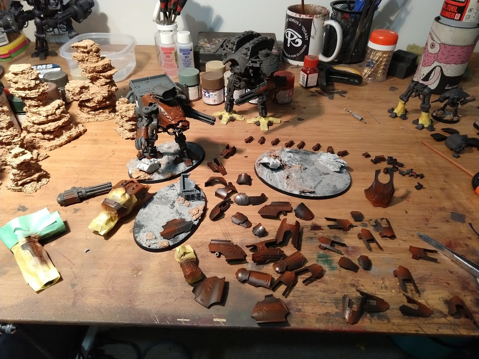 I pushed the contrast on the 'Rust' coloured armour plating further with a modulated orange pass to get it where I wanted it. The scheme on the wiki says rust panels with a bone coloured trim but I've seen a model at the open day where they did purple contrast panels and it looked alright.